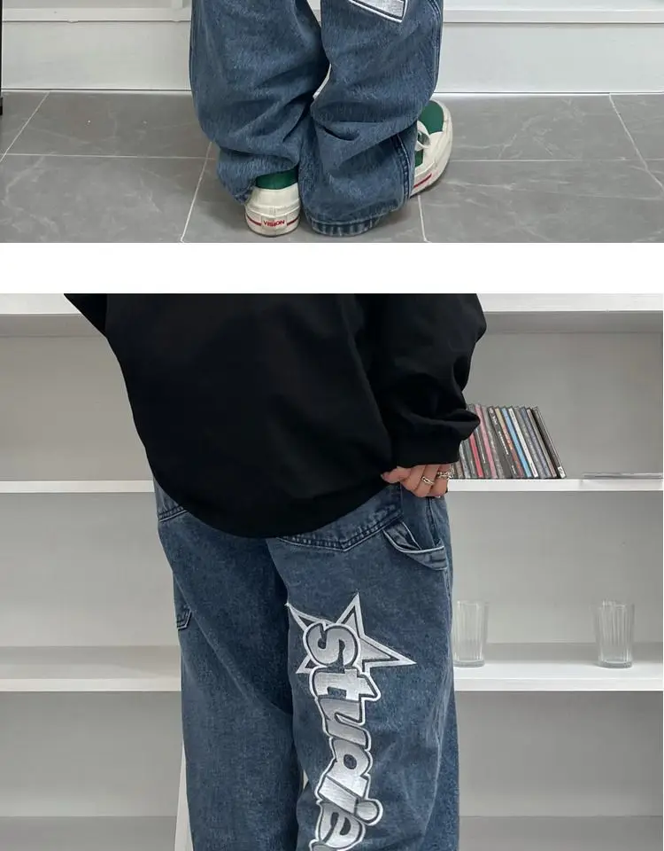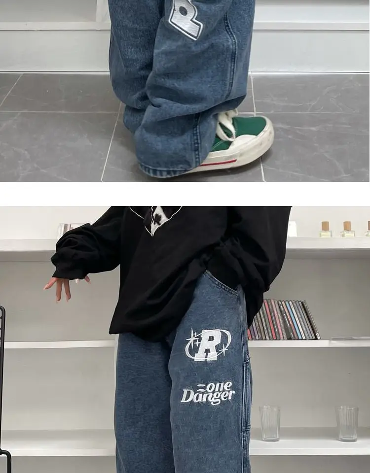 Este Americano high street jeans dos homens europeus americanos mulheres na moda marca hiphop esfregando impressão ampla perna casais macacão pode ser seu por apenas R$ 86,85!