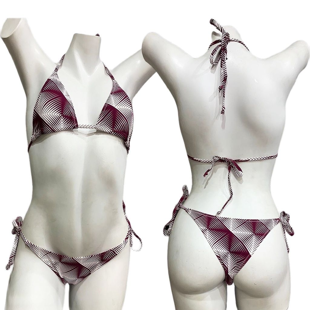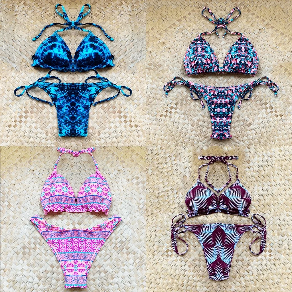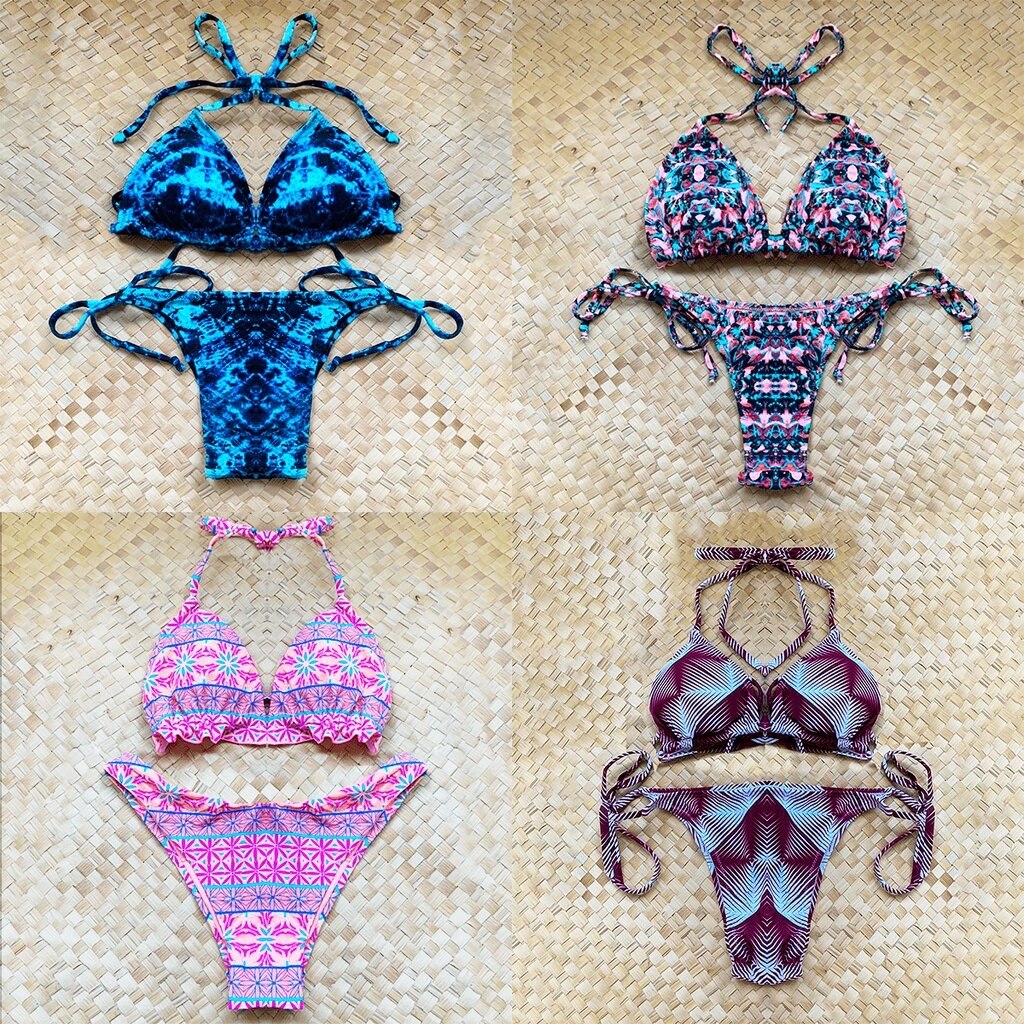 Biquini cortininha com mistura de estampas alças finas tecido leve