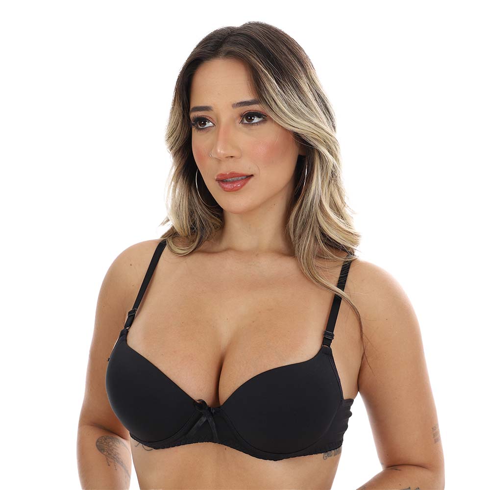 Sutiã com bojo tradicional confeccionado em poliamida. Possui lindo lacinho de cetim. A pala tem elástico embutido proporcionando melhor caimento. As alças são fixas e com regulagem, e o fechamento traseiro com colchetes duplos tem dois níveis de ajuste.