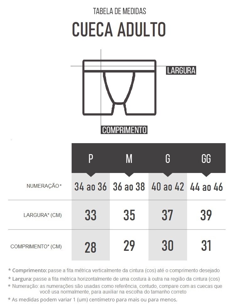 *Os kits acompanham cuecas de cores Chumbo, Preto e Azul Marinho.