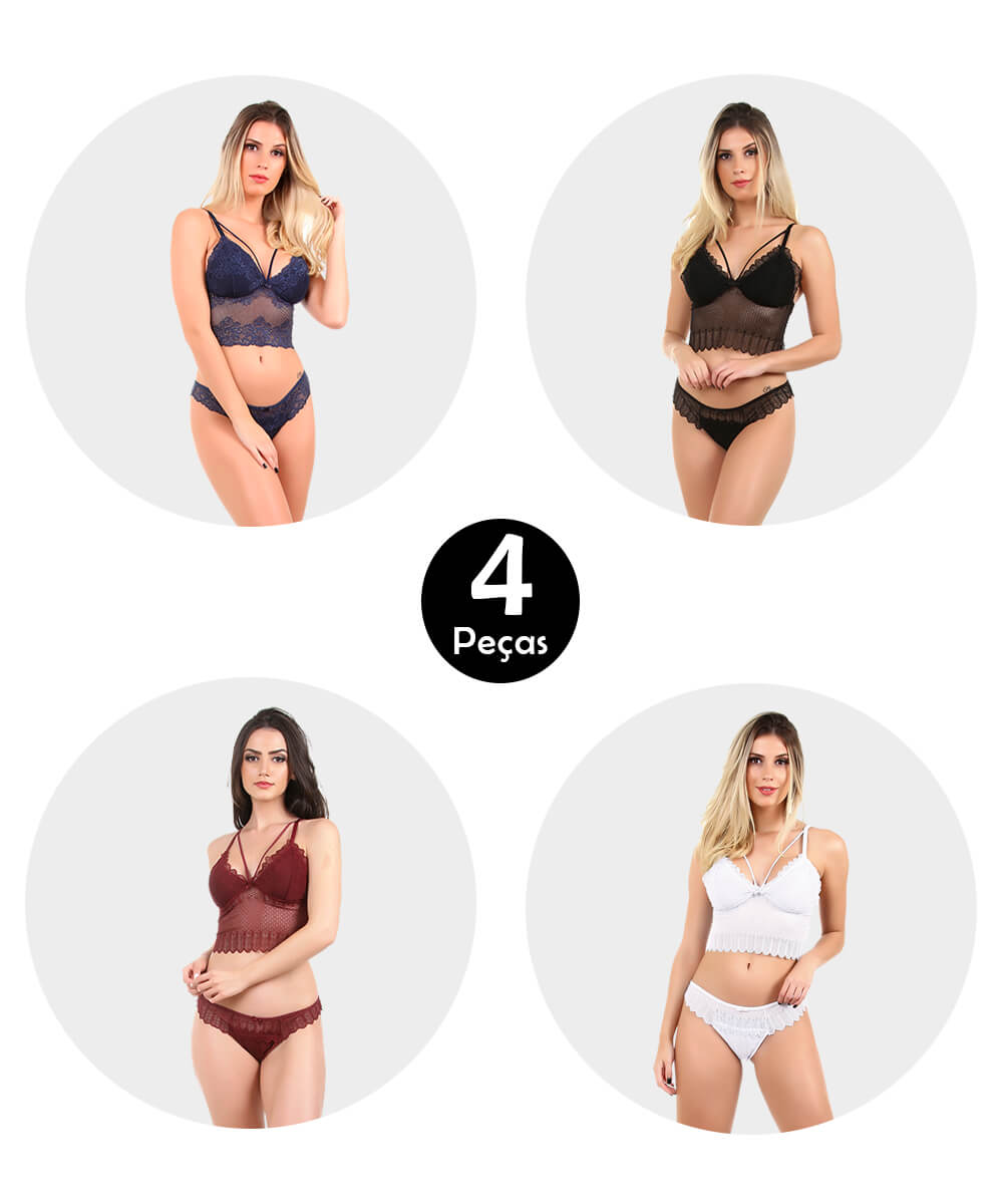 Kit 4 Conjunto IMI Lingerie Sem bojo Cropped Em Renda Stefanie