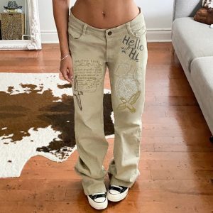 Vintage demin calças para mulheres streetwear solto cintura baixa impresso denim calças 2021 retro y2k moda carga calças jeans